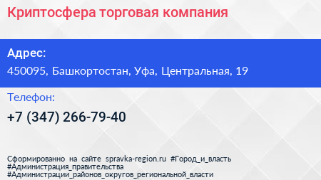Криптосфера, торговая компания по адресу 450095, Башкортостан, Уфа, Центральная, 19 в дальнейшем Организация, размещена в следующих категориях: