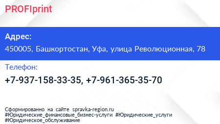 PROFIprint по адресу 450005, Башкортостан, Уфа, улица Революционная, 78 в дальнейшем Организация, размещена в следующих категориях:
