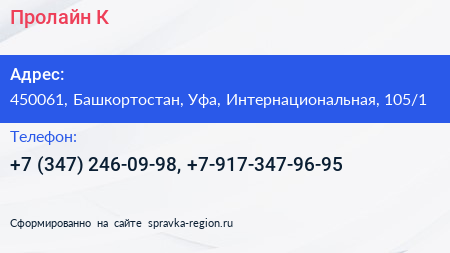 Пролайн-К по адресу 450061, Башкортостан, Уфа, Интернациональная, 105/1 в дальнейшем Организация, размещена в следующих категориях: