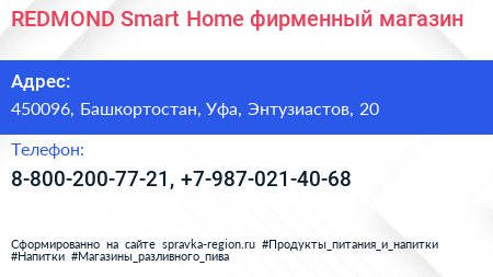 REDMOND Smart Home, фирменный магазин по адресу 450096, Башкортостан, Уфа, Энтузиастов, 20 в дальнейшем Организация, размещена в следующих категориях: