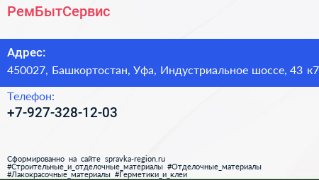 РемБытСервис по адресу 450027, Башкортостан, Уфа, Индустриальное шоссе, 43 к7 в дальнейшем Организация, размещена в следующих категориях: