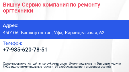 Вишну Сервис, компания по ремонту оргтехники по адресу 450106, Башкортостан, Уфа, Караидельская, 62 в дальнейшем Организация, размещена в следующих категориях:
