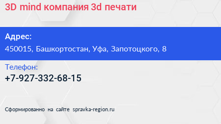 3D-mind, компания 3d-печати по адресу 450015, Башкортостан, Уфа, Запотоцкого, 8 в дальнейшем Организация, размещена в следующих категориях: