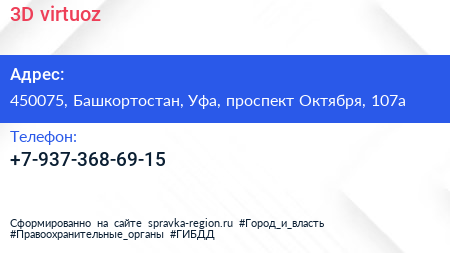 3D virtuoz по адресу 450075, Башкортостан, Уфа, проспект Октября, 107а в дальнейшем Организация, размещена в следующих категориях:
