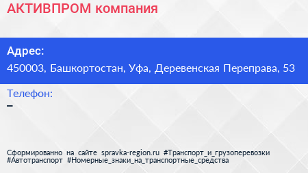 АКТИВПРОМ, компания по адресу 450003, Башкортостан, Уфа, Деревенская Переправа, 53 в дальнейшем Организация, размещена в следующих категориях: