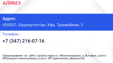 АЛИМЭ по адресу 450027, Башкортостан, Уфа, Трамвайная, 5 в дальнейшем Организация, размещена в следующих категориях: