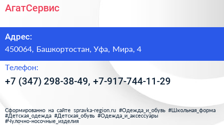 АгатСервис по адресу 450064, Башкортостан, Уфа, Мира, 4 в дальнейшем Организация, размещена в следующих категориях: