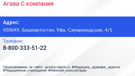 Агава-С, компания по адресу 450049, Башкортостан, Уфа, Самаркандская, 4/1 в дальнейшем Организация, размещена в следующих категориях: