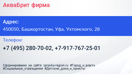 АкваБрит, фирма по адресу 450050, Башкортостан, Уфа, Ухтомского, 28 в дальнейшем Организация, размещена в следующих категориях:
