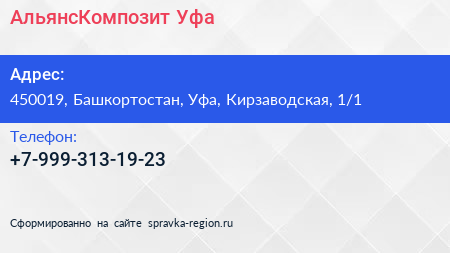 АльянсКомпозит Уфа по адресу 450019, Башкортостан, Уфа, Кирзаводская, 1/1 в дальнейшем Организация, размещена в следующих категориях:
