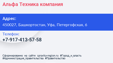 Альфа Техника, компания по адресу 450027, Башкортостан, Уфа, Петергофская, 6 в дальнейшем Организация, размещена в следующих категориях: