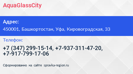 AquaGlassCitу по адресу 450001, Башкортостан, Уфа, Кировоградская, 33 в дальнейшем Организация, размещена в следующих категориях: