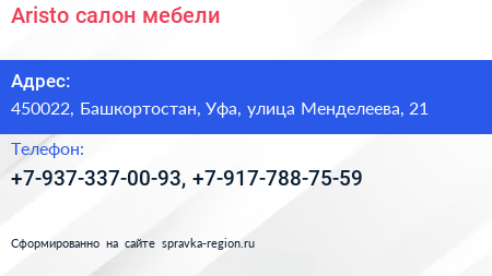 Aristo, салон мебели по адресу 450022, Башкортостан, Уфа, улица Менделеева, 21 в дальнейшем Организация, размещена в следующих категориях: