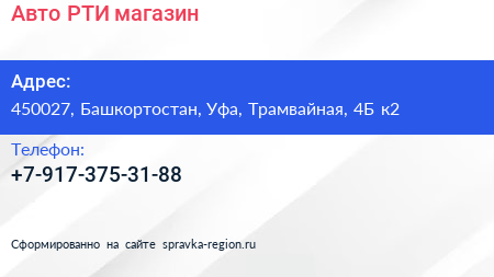 Авто РТИ, магазин по адресу 450027, Башкортостан, Уфа, Трамвайная, 4Б к2 в дальнейшем Организация, размещена в следующих категориях: