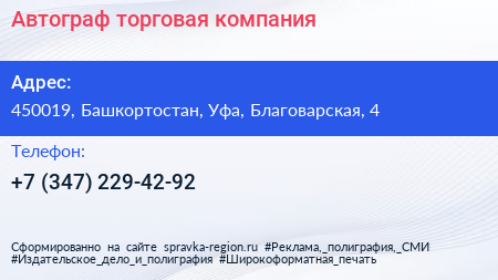 Автограф, торговая компания по адресу 450019, Башкортостан, Уфа, Благоварская, 4 в дальнейшем Организация, размещена в следующих категориях: