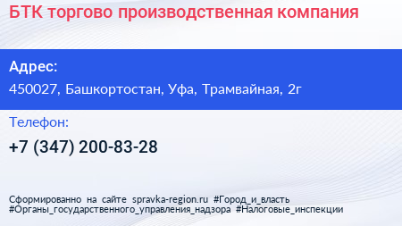 БТК, торгово-производственная компания по адресу 450027, Башкортостан, Уфа, Трамвайная, 2г в дальнейшем Организация, размещена в следующих категориях: