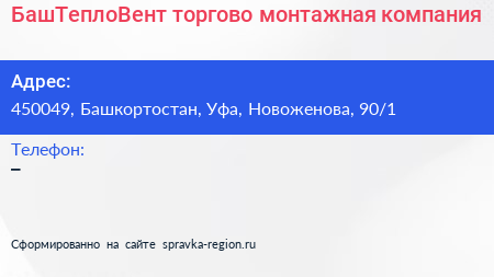 БашТеплоВент, торгово-монтажная компания по адресу 450049, Башкортостан, Уфа, Новоженова, 90/1 в дальнейшем Организация, размещена в следующих категориях: