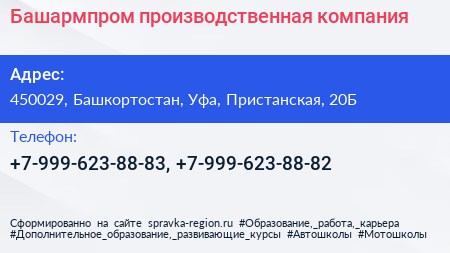 Башармпром, производственная компания по адресу 450029, Башкортостан, Уфа, Пристанская, 20Б в дальнейшем Организация, размещена в следующих категориях: