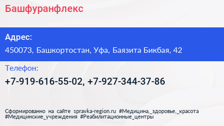 Башфуранфлекс по адресу 450073, Башкортостан, Уфа, Баязита Бикбая, 42 в дальнейшем Организация, размещена в следующих категориях: