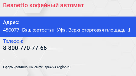 Beanetto, кофейный автомат по адресу 450077, Башкортостан, Уфа, Верхнеторговая площадь, 1 в дальнейшем Организация, размещена в следующих категориях: