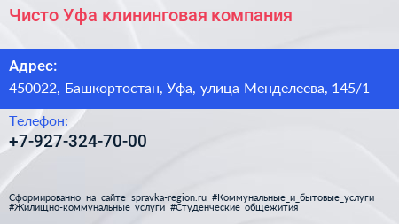 Чисто Уфа, клининговая компания по адресу 450022, Башкортостан, Уфа, улица Менделеева, 145/1 в дальнейшем Организация, размещена в следующих категориях: