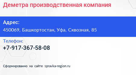 Деметра, производственная компания по адресу 450069, Башкортостан, Уфа, Сквозная, 85 в дальнейшем Организация, размещена в следующих категориях: