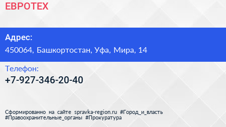 ЕВРОТЕХ по адресу 450064, Башкортостан, Уфа, Мира, 14 в дальнейшем Организация, размещена в следующих категориях: