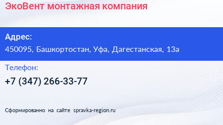 ЭкоВент, монтажная компания по адресу 450095, Башкортостан, Уфа, Дагестанская, 13а в дальнейшем Организация, размещена в следующих категориях: