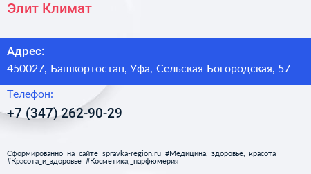 Элит Климат по адресу 450027, Башкортостан, Уфа, Сельская Богородская, 57 в дальнейшем Организация, размещена в следующих категориях: