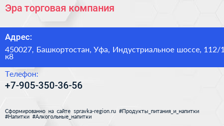 Эра, торговая компания по адресу 450027, Башкортостан, Уфа, Индустриальное шоссе, 112/1 к8 в дальнейшем Организация, размещена в следующих категориях: