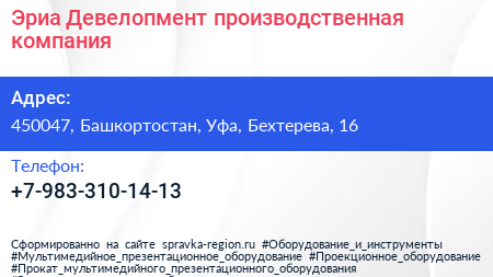 Эриа Девелопмент, производственная компания по адресу 450047, Башкортостан, Уфа, Бехтерева, 16 в дальнейшем Организация, размещена в следующих категориях: