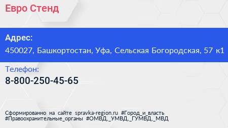 Евро Стенд по адресу 450027, Башкортостан, Уфа, Сельская Богородская, 57 к1 в дальнейшем Организация, размещена в следующих категориях: