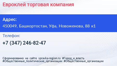 Евроклей, торговая компания по адресу 450049, Башкортостан, Уфа, Новоженова, 88 к1 в дальнейшем Организация, размещена в следующих категориях: