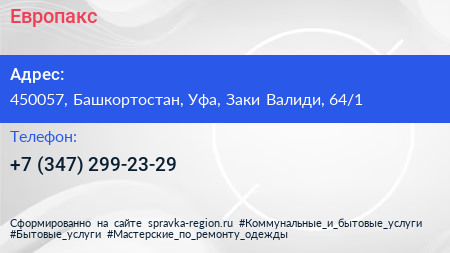 Европакс по адресу 450057, Башкортостан, Уфа, Заки Валиди, 64/1 в дальнейшем Организация, размещена в следующих категориях: