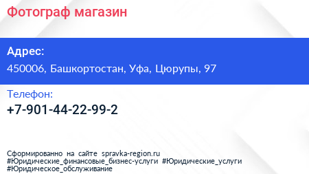 Фотограф, магазин по адресу 450006, Башкортостан, Уфа, Цюрупы, 97 в дальнейшем Организация, размещена в следующих категориях: