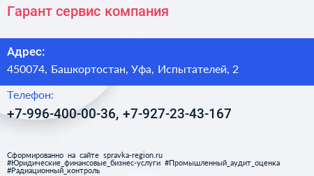 Гарант сервис, компания по адресу 450074, Башкортостан, Уфа, Испытателей, 2 в дальнейшем Организация, размещена в следующих категориях: