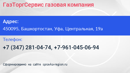 ГазТоргСервис, газовая компания по адресу 450095, Башкортостан, Уфа, Центральная, 19а в дальнейшем Организация, размещена в следующих категориях: