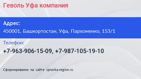 Геволь-Уфа, компания по адресу 450001, Башкортостан, Уфа, Пархоменко, 153/1 в дальнейшем Организация, размещена в следующих категориях: