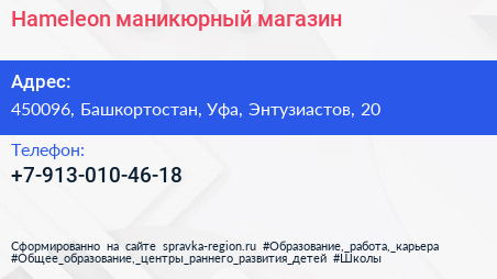 Hameleon, маникюрный магазин по адресу 450096, Башкортостан, Уфа, Энтузиастов, 20 в дальнейшем Организация, размещена в следующих категориях: