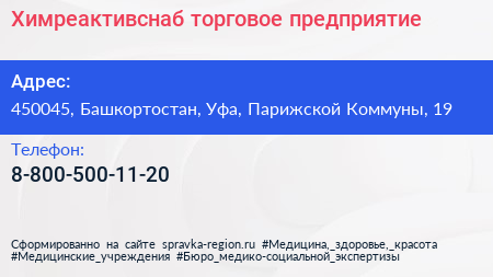 Химреактивснаб, торговое предприятие по адресу 450045, Башкортостан, Уфа, Парижской Коммуны, 19 в дальнейшем Организация, размещена в следующих категориях: