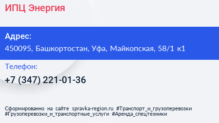 ИПЦ Энергия по адресу 450095, Башкортостан, Уфа, Майкопская, 58/1 к1 в дальнейшем Организация, размещена в следующих категориях: