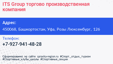 ITS Group, торгово-производственная компания по адресу 450068, Башкортостан, Уфа, Розы Люксембург, 126 в дальнейшем Организация, размещена в следующих категориях: