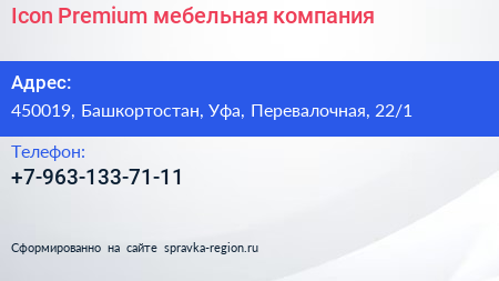 Icon Premium, мебельная компания по адресу 450019, Башкортостан, Уфа, Перевалочная, 22/1 в дальнейшем Организация, размещена в следующих категориях: