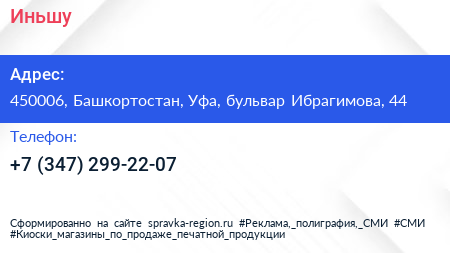 Иньшу по адресу 450006, Башкортостан, Уфа, бульвар Ибрагимова, 44 в дальнейшем Организация, размещена в следующих категориях: