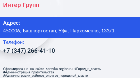 Интер Групп по адресу 450006, Башкортостан, Уфа, Пархоменко, 133/1 в дальнейшем Организация, размещена в следующих категориях: