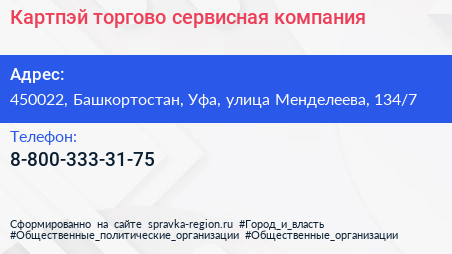 Картпэй, торгово-сервисная компания по адресу 450022, Башкортостан, Уфа, улица Менделеева, 134/7 в дальнейшем Организация, размещена в следующих категориях: