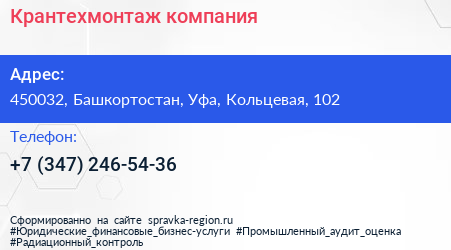 Крантехмонтаж, компания по адресу 450032, Башкортостан, Уфа, Кольцевая, 102 в дальнейшем Организация, размещена в следующих категориях: