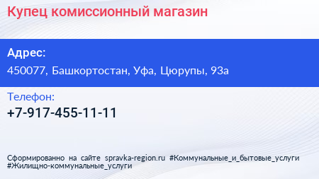 Купец, комиссионный магазин по адресу 450077, Башкортостан, Уфа, Цюрупы, 93а в дальнейшем Организация, размещена в следующих категориях: