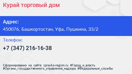 Курай, торговый дом по адресу 450076, Башкортостан, Уфа, Пушкина, 33/2 в дальнейшем Организация, размещена в следующих категориях:
