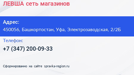 ЛЕВША, сеть магазинов по адресу 450056, Башкортостан, Уфа, Электрозаводская, 2/2Б в дальнейшем Организация, размещена в следующих категориях: